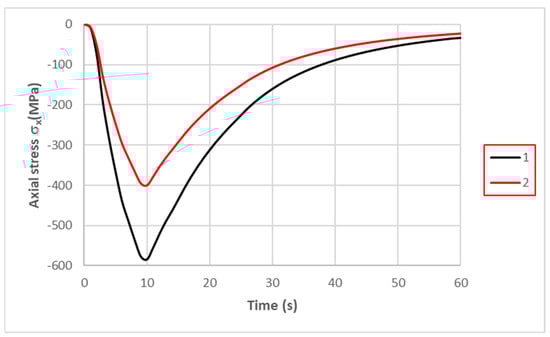 The greater stiffness of the specimen clamping affects the magnitude of the generated stresses. Figure 10 shows plots of the changes in axial stress σx at the centres of the specimens when the maximum displacements of the ends were 0.037 and 0.057 mm. The greater stiffness of the specimen clamping resulted in the smaller displacement of the end of the specimen and an increase in the value of the axial stress for the same heat loading.