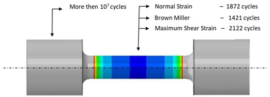 Calculations to determine the number of fatigue cycles after exceeding the point where crack initiation occurs were carried out using the fe-safe program. The fatigue cycle was defined by the states of the stress and strain in the specimen occurring at three time points of a cycle: at the beginning, at the moment of the maximum strain and stress, and at the end of the cycle. In the computational model, the surface roughness was assumed to be Ra = 20 μm. Figure 13 shows a model of the specimen with a colour map plotted on its surface showing the numbers of cycles that initiated cracks. The calculations were carried out for a material with the properties of SLM steel aged at 490 °C. The specimen model was constrained at two ends, and the number of cycles was calculated based on three fatigue criteria based on the critical plane concept. The figure shows the numbers of crack-initiating cycles that were calculated according to the N-S, B–M, and Max-Sh-St criteria.