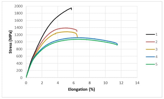 Typical tensile curves of specimens that were previously subjected to different numbers of thermal fatigue cycles: 1—reference sample; 2—100 cycles; 3—3000 cycles; 4—8000 cycles; and 5—16,000 cycles.