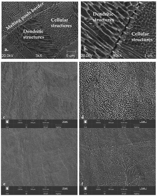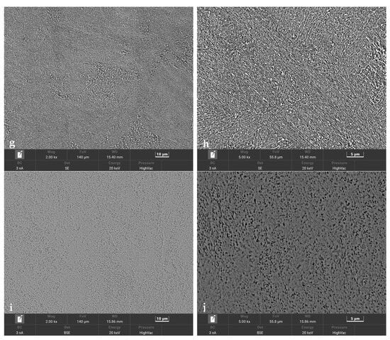 The metallographic tests that were carried out on 1.2709 SLM HT490 steel were designed to reveal the changes occurring in the structure as a result of thermal fatigue. After the tensile tests, the specimens were cut along a plane parallel to the specimen axis. As mentioned earlier, the specimen axis was positioned perpendicularly to the surface of the work platform during the printing. The images in Figure 15 show the differences between the structure of the steel after HT490 ageing and temperature cycling and the structure of the as-built condition steel. When observed with the scanning microscope, the as-built condition steel structure showed areas of cellular and dendritic structures as well as boundaries between the grains and the areas of the remelting (Figure 15a,b). The phenomenon of epitaxial cell growth was also visible (Figure 15b). The heat treatment of the steel by ageing HT490 caused the boundaries between the cells and the grains to become less distinguishable, but the scanning images partially revealed their presence in this case (Figure 15c,d). In the scanning images of the aged steels that were subjected to temperature cycling (100 cycles), the grain boundaries and cellular or dendritic structures were practically invisible at different image magnifications (Figure 15e,f). Increasing the number of fatigue cycles (8000 cycles) no longer caused visible changes in the microstructure image (Figure 15g,h). Above 16,000 cycles, the cellular structure of the alloy was no longer visible (Figure 15i,j).