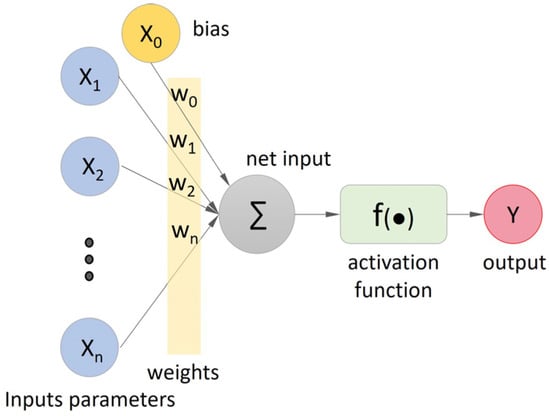 Inspired by the human brain, artificial neural networks establish connections with neurons, organizing them into one or more layers. These connections are characterized by synaptic weights, which can be used to store information. Haykin [] states that artificial neural networks have five essential elements, as in the perceptron neural network illustrated in Figure 1. These elements are associated with: (i) a set of inputs, each with its weight, simulating dendritic activity; (ii) an adder processing input signals through neuron synapses; (iii) an activation function constraining the output range; (iv) a bias adjusting the net input to the activation function; and (v) a network-generated output symbolizing the axonal response. Thus, Equation (1) represents a single perceptron with n inputs.
