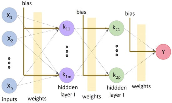 The MLP comprises interconnected layers—input, hidden, and output. The input layer processes features, whereas the hidden layers use weighted sums and activation functions to introduce nonlinearity []. Using an appropriate activation function, the output layer generates predictions. During training, a feedforward network adjusts weights through a backpropagation algorithm to minimize prediction errors. The weights are fine-tuned using optimization algorithms, such as gradient descent.