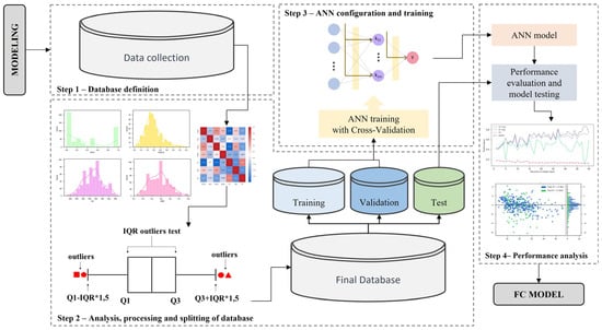 The methodological procedure depicted in Figure 3 was used in this study to generate artificial neural network regression models to predict the compression strength of concrete-containing recycled aggregates. Different topologies, training algorithms, and activation functions were combined to create the ANN models. The modeling procedure was divided into four stages, which are described in detail in the following sections.