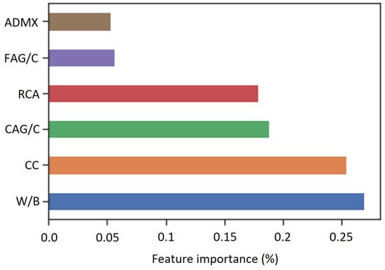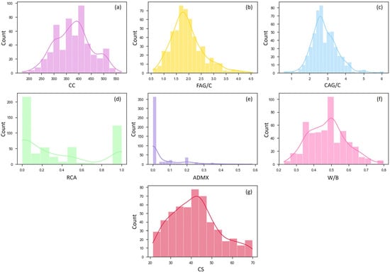 The results of experimental compression-strength tests at 28 days (CS) performed by various research groups were collected from 38 studies [,,,,,,,,,,,,,,,,,,,,,,,,,,,,,,,,,,,,,], forming the initial database, which contained 721 samples. The initial database was created using results in the literature for concrete with recycled coarse aggregate derived from cementitious waste (concrete and mortar). Cement consumption in kg/m3 (CC), fine-aggregate–cement ratio (FAG/C), coarse-aggregate–cement ratio (CAG/C), recycled-aggregate-replacement rate (RCA), mineral-admixture–cement ratio (ADMX), and water–binder ratio (W/B) were the features of the collected data. Figure 4 depicts the frequency distribution of the entire database based on the features, and Table 1 displays the maximum, minimum, average, standard deviation, and first-, second-, and third-quartile values.
