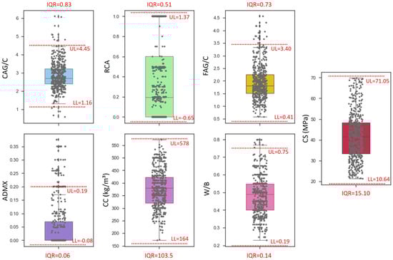 Some observations within a dataset may be beyond the overall scope of other observations. Outliers are observations that deviate from the norm. On the original dataset, the inter quartile range (IQR) outlier-detection approach was employed to examine the database’s representativeness and discover any outliers. The IQR is calculated by the difference between the third (Q3) and first (Q1) quartiles, as indicated in Equation (14). After computing the IQR, it is advisable to remove data from the database that have attributes with values that are either above the upper limit (UL) or below the lower limit (LL), both of which are calculated by Equations (15) and (16), respectively.