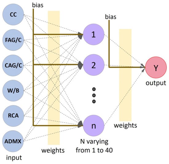 Forty ANN topologies were designed to predict the RAC’s compression strength, with six neurons in the input layer (associated with CC, FAG/C, CAG/C, W/B, RCA, and ADMX), a hidden layer with neurons ranging from 1 to 40, and one neuron in the output layer (Figure 6). The ANNs were trained using the cross-validation method, as suggested by Felix et al. [].