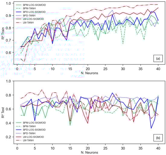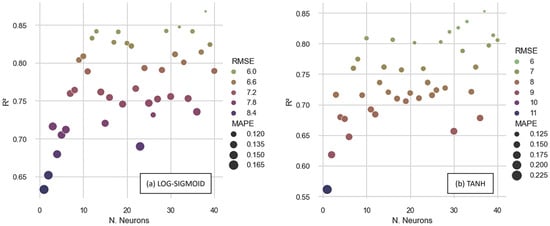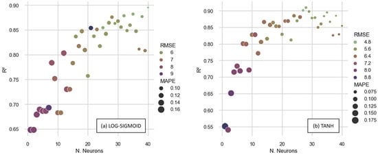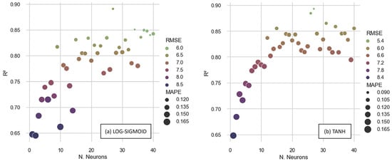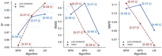 The performance metrics R2, RMSE, and MAPE were examined after training all 240 ANNs, defined by combining the three training methods (BPM, BPD, and LM) with the two activation functions (TANH and LOG-SIGMOID) and with the forty topologies (Figure 6).