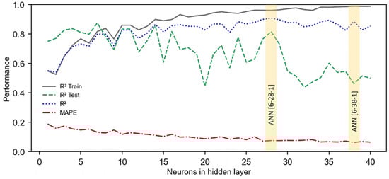 Figure 10 illustrates that when the number of neurons in the hidden layer exceeds 28, the ANN performance in the training phase improves but declines in the testing analysis. This results in the creation of rigid models, in a process known as overfitting. Rigid models fit training data well but lack predictive power for new predictions []. Therefore, since the aim is to produce predictive models that accurately depict real conditions, the topology [6-28-1] demonstrates superior performance in comparison to [6-38-1]. This is because it possesses a higher determination coefficient in testing (0.836), with similar values for the MAPE and overall R2.