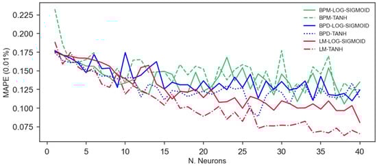 MAPE variation with the number of neurons, activation function, and algorithm.