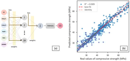 Rizvon et al. [] evaluated the applicability of three machine learning techniques for predicting the RAC’s compressive strength: random forest, ANN, and least absolute shrinkage and selection operator (LASSO). The networks were trained using a single hidden layer, seven neurons in the input layer, and a single output. The Levenberg–Marquardt algorithm was used in the ANN training. The technique with the best performance was determined with 12 neurons in the hidden layer, achieving a determination coefficient of 0.92 and an AARE of 2.54%.