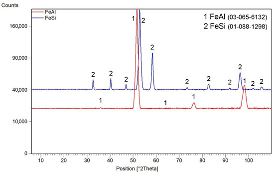 After mechanical alloying, an X-ray diffraction analysis was performed in order to verify the composition of the powder materials, see Figure 1. Iron silicide FeSi (cubic, P213 space group, 4.4950 × 10−10 m) was formed by mechanical alloying of the Fe–Si powder mixture after milling for 10 h. In the case of iron and aluminium powders, iron aluminide FeAl (cubic, Pm-3m space group, a = 2.9076 × 10−10 m) was formed. No other phases were detected, so the powders can be considered as almost pure FeSi and FeAl phases, considering the detection limit of XRD.