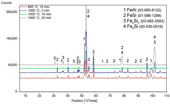 The samples sintered at 1000 °C contain, in addition to the FeAl phase, the following iron silicides: FeSi, Fe5Si3 and Fe3Si (cubic, Im-3m, a = 2.8410 × 10−10 m). At this temperature and pressure, as the holding time increases, the representation of Fe3Si silicide increases at the expense of the FeSi and Fe5Si3 silicides, as seen in Figure 3.