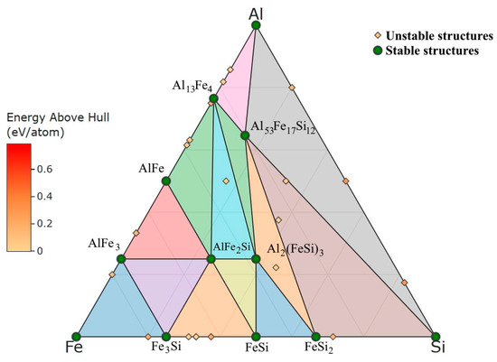 Phase diagram of stable and unstable Al–Fe–Si structures obtained by DFT calculations (at.%) at a theoretical temperature of 0 K.