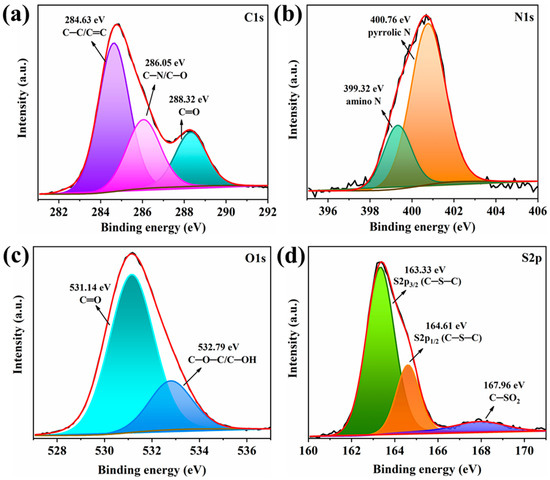High-resolution XPS spectra of (a) C1s, (b) N1s, (c) O1s, and (d) S2p of the NS-CDs.
