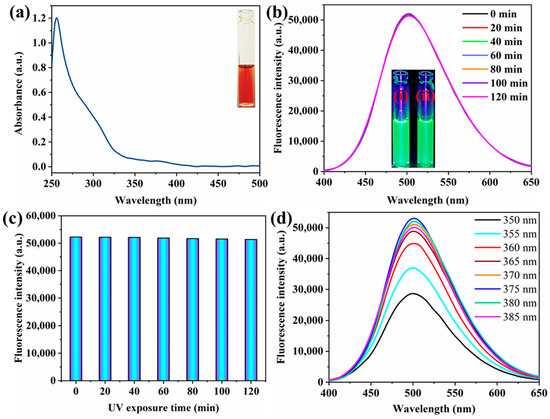 The optical properties of the NS-CDs were investigated using UV–vis absorption and fluorescence spectra. In Figure 3a, a wide absorption region around 300 nm arises from the π–π* transitions of the aromatic sp2 domains [42]. Another absorption peak at 377 nm can be ascribed to the trapping of excited-state energy of the surface states contributed by the functional groups connected to the surface of the NS-CDs [43]. This peak might be consistent with the optimal excitation peak for NS-CDs. As shown in the inset of Figure 3a, the aqueous solution of NS-CDs was a wine-red color in visible light and displayed a strong green fluorescence under UV illumination (λ = 365 nm), illustrating the excellent luminescence properties of NS-CDs with good dispersibility. The photostability of the NS-CDs was verified at different time intervals (0, 20, 40, 60, 80, 100, and 120 min) by illuminating the NS-CDs with UV light continuously for up to 120 min. As displayed in Figure 3b, the fluorescence intensities were not significantly different before and after the UV illumination. This is further detailed by the bar chart in Figure 3c, showing that the NS-CDs have excellent photostability against photobleaching.