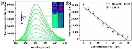 As the developed NS-CDs probe exhibited excellent fluorescence properties, the performance of the fluorescence probe in the quantitative detection of QT was examined by carrying out titration experiments under optimal conditions. For the excitation at 375 nm, the fluorescence intensity of the NS-CDs was exactly 500 nm. As shown in Figure 4a, the fluorescence intensity was sensitive to QT and was systematically reduced with the increase in the QT concentration (0–39.6 μM), signifying a typical concentration-dependent behavior of the probe. Upon increasing the concentration to 39.6 μM, the fluorescence of the NS-CDs was almost quenched by 97%, signifying the competence of the proposed fluorescence probe. As shown in Figure 4b, the fluorescence intensity of the NS-CDs has a good linear relationship with the concentration of QT in the range between 0 and 29.7 μM. This linear portion of the plot can be fitted into the equation F0/F = −1666[QT] + 47,416, R2 = 0.9816, where F0 and F represent the fluorescence intensities of the NS-CDs without QT and with QT, respectively, and [QT] is the quencher’s concentration. The LOD was determined from the equation LOD = 3σ/m, where σ is the standard deviation obtained from the blank measurement (n = 5) and m is the slope acquired from the linear plot [45]. The value of the LOD was 17.3 nM. In terms of the linear detection range and LOD, a comparison of the current fluorescence probe with previously reported probes is given in Table 1. Obviously, the LOD of the present approach is significantly lower than in other reported works, which reveals that NS-CDs can perform well in practical fluorescence-based analytical applications.