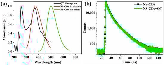 Of the various types of quenching mechanisms, Förster resonance energy transfer (FRET) ensues when the emission spectrum of the fluorophore overlaps the absorption spectrum of the quencher molecule, as well as if the distance between them is less than 10 nm [53]. In the case of the IFE, a spectral overlap occurs between the excitation and/or emission spectrum of the fluorophore and the absorption spectrum of the quencher molecule [54]. Also, in the presence of a quencher, the fluorescence lifetime of the fluorophore decreases in the FRET process, while it remains constant in the IFE process [55]. So, in order to reveal the quenching mechanism, the spectra of QT and NS-CDs were studied first. In Figure 5a, the absorption band of QT at 370 nm overlaps with the excitation band of the NS-CDs at 375 nm, suggesting that the QT-induced fluorescence quenching effect may be due to the presence of an IFE or FRET. To elucidate this further, the fluorescence lifetimes of the NS-CDs without QT (τ0) and with QT (τ1) were measured. The data were fitted using a triple exponential model and are shown in Figure 5b. The values were τ0 = 8.73 ns and τ1 = 8.54 ns for bare the NS-CDs and QT-added NS-CDs, respectively. As the lifetime values were almost the same, the possibility of the FRET mechanism could be ruled out. So, the IFE could be the main mechanism for the fluorescence quenching of NS-CDs.