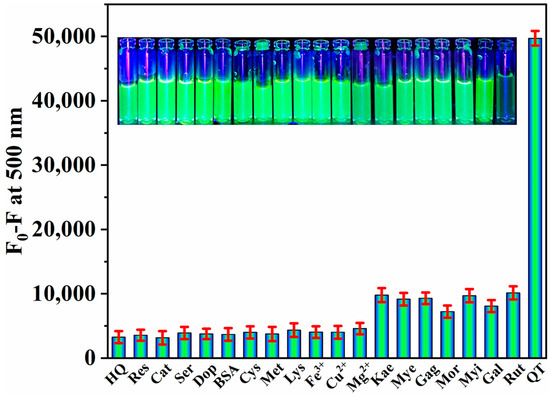 The specificity of the NS-CDs fluorescence probe for QT was appraised in ultrapure water based on the fluorescence change upon excitation at 375 nm. Various chemical compounds, such as phenols, biomolecules, amino acids, metal ions, and flavonoids, acted as potential interferents against QT. Hydroquinone (HQ), resorcinol (Res), catechol (Cat), serotonin (Ser), dopamine (Dop), bovine serum albumin (BSA), cysteine (Cys), methionine (Met), lysine (Lys), Fe3+, Cu2+, Mg2+, kaempferol (Kae), myricetin (Mye), galangin (Gag), morin (Mor), myricitrin (Myi), gallic acid (Gal), and rutin (Rut) were taken fivefold with NS-CDs, and the corresponding fluorescence intensity was recorded. As displayed in Figure 6, QT quenched the fluorescence intensity of NS-CDs effectively compared to the same concentration of other interferents. The poor quenching efficiency of some interferents for the fluorescence response of NS-CDs might be due to the minimal overlap between the excitation or fluorescence spectrum of NS-CDs and the absorption spectrum of the interferents, leading to a weak IFE.