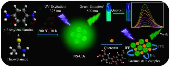 We fabricated N- and S-codoped CDs (NS-CDs) using two simple precursors, i.e., p-phenylenediamine (p-PD) and thioacetamide, through a one-step solvothermal route with ethanol as a solvent. The p-PD has two –NH2 groups, while thioacetamide has C–NH2 and C=S groups. In contrast to previously reported CDs for QT sensing, the current NS-CDs were prepared under mild reaction conditions without any acids, complex molecules, or metal salts. The as-synthesized NS-CDs exhibited a large Stokes shift (~125 nm) with green emission for the excitation at 375 nm. However, the fluorescence was effectively quenched by QT through the inner filter effect (IFE), with a noticeable color change from green to a colorless solution. The quenching-based sensing strategy offered the lowest detection limit of 17.3 nM within the linear range of 0–29.7 μM, with good specificity against various interfering elements. The present work enabled the quantification of QT in food samples, which would be beneficial for maintaining good health and preventing chronic diseases. A diagram of the NS-CDs’ synthesis and QT detection is given in Scheme 1.