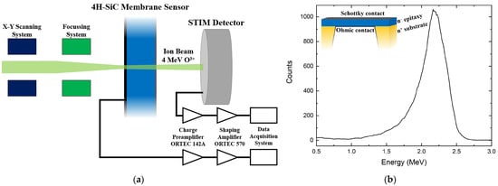 (a) Schematic of the experimental setup for the calculation of the sensor thickness and counting measurements; (b) energy spectrum obtained by the STIM detector used for the determination of the SiC sensor thickness. In the insert, a schematic cross-section of the SiC sensor is shown.