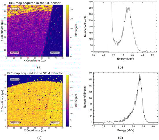 (a) IBIC map acquired by the SiC sensor and the corresponding energy spectrum (b); (c) IBIC map acquired by the STIM detector and its corresponding energy spectrum (d). Both maps were acquired simultaneously using a 4 MeV O3+ ion beam.