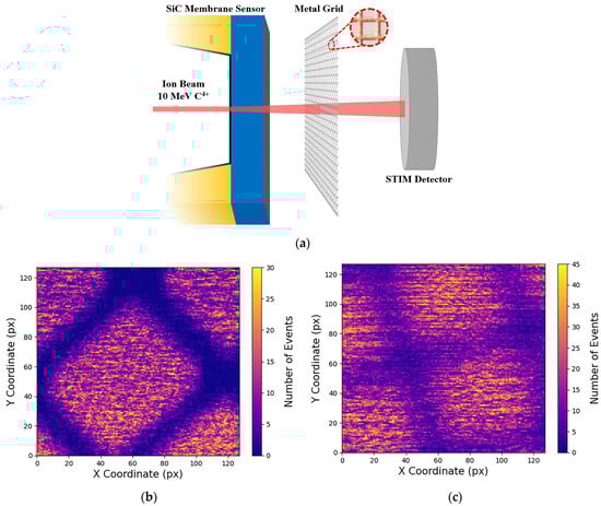 (a) Schematic representation of the experimental setup used for the lateral straggling determination; (b) STIM map acquired without the SiC membrane sensor; (c) STIM map acquired with ions passing through the SiC membrane sensor. Both maps were acquired using a 10 MeV C4+ ion beam.