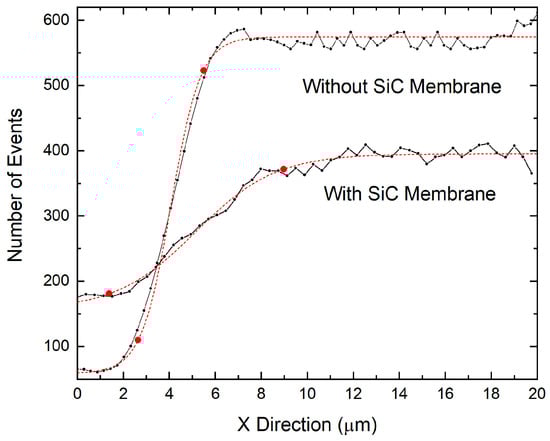 Count event profile close to the grid projection edges measured by the STIM detector without and with the SiC membrane sensor. The black dotted line represents the number of events measured as a function of position. The dashed red curves represent the Boltzmann sigmoidal function fitted to the experimental data. The points marked in red enclose the data interval between 10% and 90% of the upper plateau value.