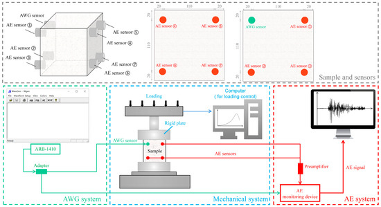 The test system is composed of mechanical, AE, and AWG systems, as shown in Figure 1. The mechanical system is SUNS universal testing machine. The AE system is Sensor Highway 3 AE device and is used to collect AE signals. AE sensor is PK15I narrow-band resonance sensor, and the operating frequency range is 100–450 kHz. The lower limit of frequency filtering is 20 kHz, and the upper limit is 1 MHz. The sampling frequency is 1 MHz. The AWG system is an arbitrary waveform generator (AWG), and the model is ARB-1410. The software WaveGen 13.0 can control the AWG to transmit AE signals of different frequencies. After initial testing, AWG signals of 120 kHz were relatively stable. Therefore, the signal of this frequency was selected for active AE test. Three AE and one AWG measuring points were set up on the left side of the sample, and four AE measuring points were set up on the right side of the sample. The field ambient noise and mechanical noise were less than 35 dB, so the AE threshold value was set to 40 dB.