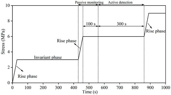 As shown in Figure 2, the test adopted the step-loading method. The loading process included Rise phase (RP) and Invariant phase (IP). The loading rate of RP was 0.1 MPa/s, and the RP lasted for 30 s. AE damage signals were collected throughout the RP, which is called passive monitoring. During the IP, which lasted for 400 s, the load remained unchanged. The samples were loaded to failure according to the above loading program. To eliminate the mutual interference between active and passive tests, the active test was conducted during the last 300 s of IP. The AWG was used to excite active signals, and the signals were received by 4#~7# AE sensors, which is called active detection.