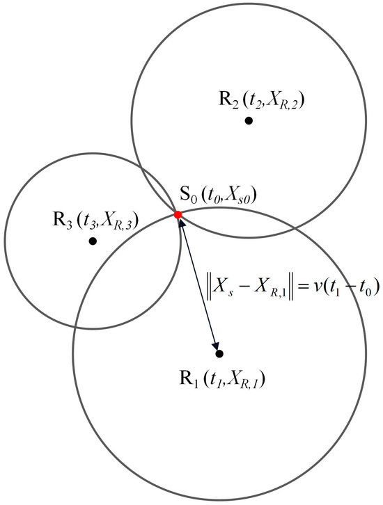 The basic idea of traditional time-of-arrival localization method is to estimate the location of AE source by the difference of arrival time of AE signal from different sensors and AE wave velocity. As shown in Figure 3, when an AE signal is received by multiple AE sensors (R1, R2, R3), AE wave velocity can be calculated using Formula (1). Then the source location is calculated using Formula (8):