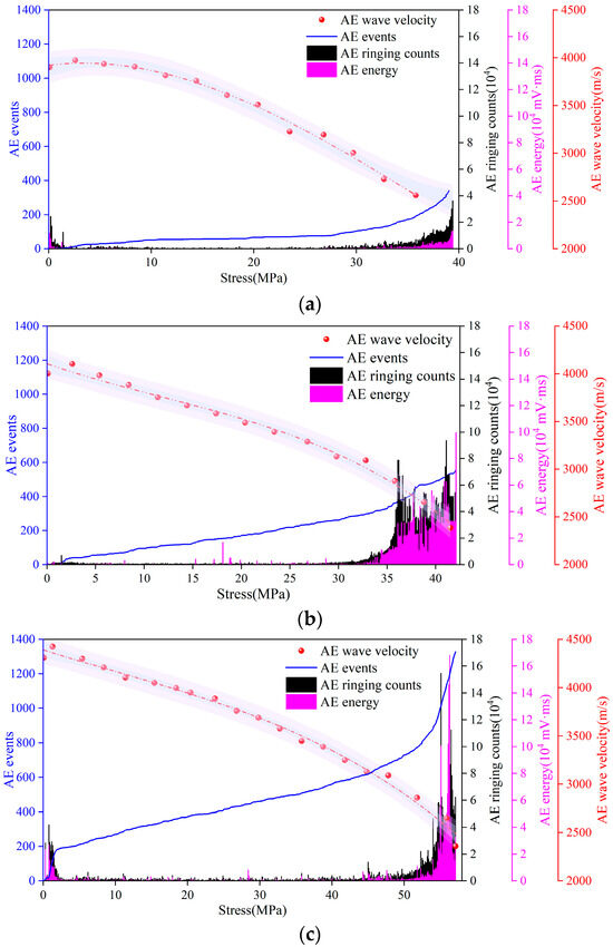 Wave velocity fitted curve and the relationship between stress and AE parameters for (a) Group A, (b) Group B, and (c) Group C.