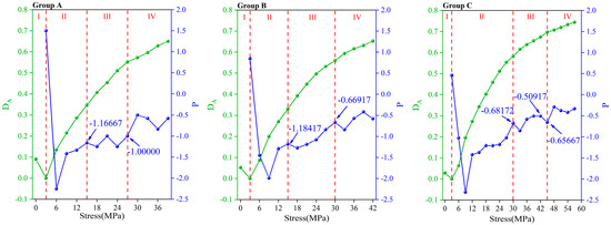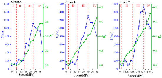 As shown in Figure 5, S and Dv in each group showed similar changes. Dv represents the initial damage of the concrete before loading. During stage I (stress level 0–10%), the degree of damage of the concrete was reduced. Dv decreased to 0, and there was little change in S. The maximum S values of groups A, B, and C were 123 m/s, 98 m/s, and 104 m/s, respectively. During stage II (stress level 10–40%), microcracks began to develop, and Dv and S began to increase. Dv and S grew slowly during this stage because the crack development was still very slow at this time. The maximum S values of groups A, B, and C were 235 m/s, 233 m/s and 222 m/s, respectively. During stage III (stress level 40–70%), the crack development accelerated. Dv and S also accelerated, and their curves became steeper. The maximum S values of Groups A, B, and C were 1019 m/s, 1301 m/s, and 1532 m/s, respectively. At the end of this phase, the S reached its peak value. During stage IV (stress level 70 to 100%), crack development was very active, and Dv increased at a faster rate until the sample failed. However, S decreased significantly during this stage. In the last test, S in each group decreased by 62.01% (for group A), 39.43% (for group B), and 26.79% (for group C) from the peak values. In summary, S reaching 100 m/s can be used as a harbinger of the beginning of microfracture development. When S reaches 1000 m/s or drops significantly, the concrete is about to be damaged.