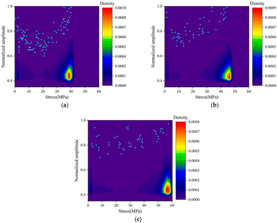 Figure 6 shows the amplitude density distribution of passive signals and 50 points with the lowest density. Signals in the low amplitude range of 0.4–0.6 occupied the largest proportion. The density of low-amplitude signals increased with the increase in stress and reached a peak density near peak stress. The high-amplitude signals with amplitudes above 0.8 were mainly distributed in the later part of the loading process. At this point, it entered the unstable phase. The AE response associated with macroscopic cracking of the sample was very dramatic. This mirrors the AE ringing and energy surge described in Section 3.1.1 because, in general, the ringing count and energy of the high-amplitude signals was generally higher. The low-density distribution of high-amplitude signals was due to the small number of such signals. Compared with the low-amplitude signals throughout the whole damage process of the concrete, the number of high-amplitude signals was not dominant.