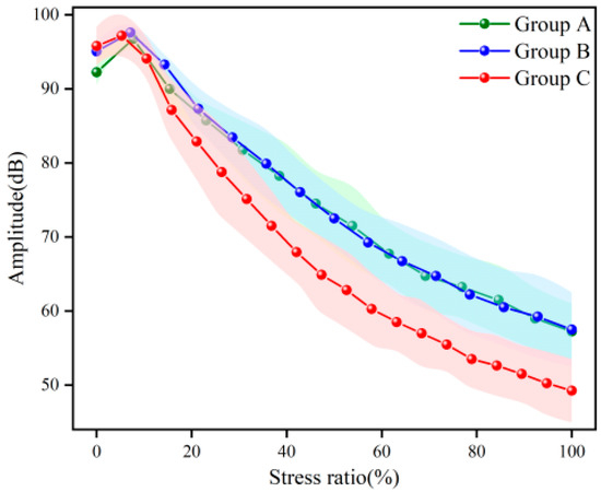 Figure 7 shows the evolution of the amplitude of active signals. Similar to wave velocity, the amplitude showed a trend of first increasing and then decreasing. Before loading, the amplitude of the samples with a low w/c ratio was higher because the samples with a low w/c ratio had smaller porosity. The propagation distance of the penetrating wave was relatively short, and the attenuation degree was small. During the compaction stage, the amplitudes of groups A, B, and C increased by 4.88%, 2.68% and 1.44%, respectively. Unlike the wave velocity, the amplitude dropped more slowly during the late loading period than during the middle loading period. According to the quality factor Q theory, there is a negative exponential relationship between the amplitude and the propagation distance [41]. Therefore, the amplitude attenuation in this test resulted in a trend from fast to slow.