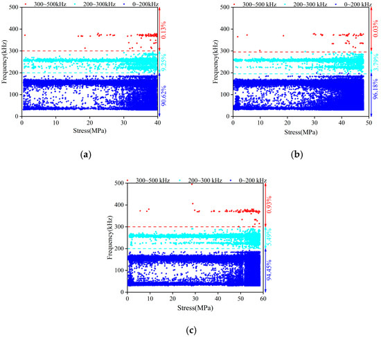 Figure 9 shows the main frequency for all passive signals. The passive signals had a wide frequency range within 0–500 kHz. Overall, the passive signals can be divided into low-frequency signals (0–200 kHz), medium-frequency signals (200–300 kHz), and high-frequency signals (300–500 kHz). The low-frequency and medium-frequency signals were almost all over the whole damage process of concrete. The proportions of low-frequency signals in groups A, B, and C were 90.62%, 96.18%, and 95.54%, respectively. The low-frequency signals occupied the dominant position regarding quantity. The high-frequency signals mainly existed during the late period of the loading process because the cracks during this period were very active, and it was easy to produce high-frequency signals. This corresponded to a surge of passive AE characteristic parameters in the later stage of loading process, as shown in Figure 3. It can be inferred that the high-frequency signals were related to the macroscopic cracking of the concrete. This feature can be used as a harbinger of concrete failure.