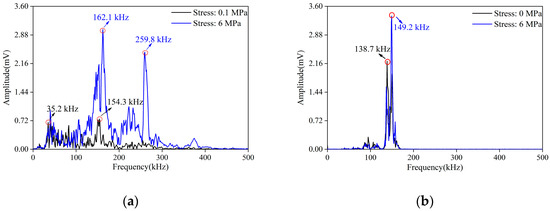 During stage I, the active signal consisted of multiple peaks, and the microcracks were closed under pressure (Figure 10). With the increase in load, the initial damage of the sample decreased, and the load was not enough to produce nascent cracks. Therefore, the main frequency and the amplitude of each frequency band of the passive signal increased. At this stage, the attenuation of the AE signals decreased. The spectrum energy of the active signals shifted from 138.7 kHz to 149.2 kHz.