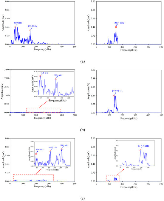 Further, taking group A as an example, the frequency spectrum signature of the signals in different damage stages were analyzed. Overall, the amplitude of the active signal was high, and the energy was concentrated near the main frequency. There was basically no energy distributed at the high-frequency bands. The main frequency and secondary frequency of the passive signals were messier, and there were even multiple secondary frequencies. The amplitude of the passive signal was lower, but the energy distribution range was significantly wider.
