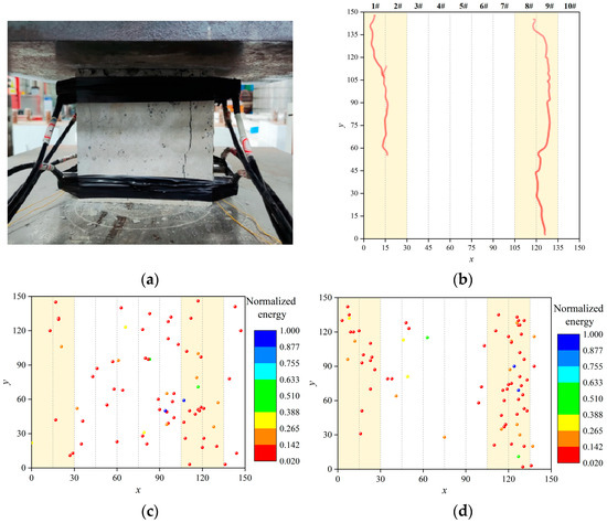 In this paper, a two-dimensional localization method was adopted. Sample A1 was taken as an example to illustrate the correction process of the localization results. Figure 12a shows the crack morphology of the front façade when the sample is damaged. Taking the lower left corner of the facade of the sample as the origin, a plane coordinate system was established, and a crack morphology diagram was drawn, as shown in Figure 12b. The coordinate planes were divided into 10 longitudinal bands numbered 1#–10#. The bands where the cracks were located were defined as the crack bands. The AE localization points within crack bands were considered accurate.