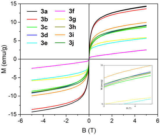 The magnetization curves were measured for all samples 3 at room temperature (Figure 1, Table 2). Compared to bulk magnetite (Ms = 92 emu/g [56]), the saturation magnetization is relatively low; however, it is still appropriate for its intended application and comparable to or better than other works [45,47,48] using a wet chemical approach to produce magnetic materials from iron mud without completely dissolving it in acid first [57]. The saturation magnetization is highest for a reaction temperature of 473.15 K (3a,b); with lower temperatures, Ms (3d–f) strongly decreases. A longer reaction time (3b) had little influence on Ms; however, there was a noticeable decrease when using shorter reaction times (3c). For an imbalanced amount of iron mud and sawdust (3g,h), Ms decreased notably/slightly, while for lower (3i) or higher concentration (3j), the saturation magnetization increased/decreased slightly compared to 3d. During the reaction there are likely two important steps happening that affect the saturation magnetization: solubilization of reducing compounds from sawdust and reduction in ferric ions to form magnetite. The decrease in Ms when a shorter reaction time was employed is likely because there was not enough time for one or both of the important steps to be completed. Since the total mass of product for 3c is almost the same as for 3b, and a mass loss could be expected due to the magnetic separation (see Section 3.1, last paragraph), it is likely that already the solubilization step is not completed. Both steps are basically complete after 17 h, so a longer reaction time will not influence the magnetization much. Lowering the reaction temperature will cause a similar effect as decreasing the reaction time, although in this case, it is more likely that the reduction in ferric ions is the step that cannot take place to the full extent. This can be concluded from the fact that the amounts of the product also decreased significantly (Table 2), more than for the shortening of reaction time (3c), and also because it is known that the temperatures needed for reduction in ferric to ferrous ions for polyol [58] and hydrothermal reactions [59,60] are higher (depending on the reaction conditions about 433.15–473.15 K). In the case of imbalanced quantities of starting materials, an under- (3g) or overreduction (3h) can take place, decreasing the overall magnetization of the material.