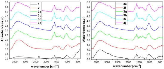 In order to evaluate functional groups, FTIR was performed for starting materials 1 and 2 as well as composites 3 (Figure 3 and Figure S1).