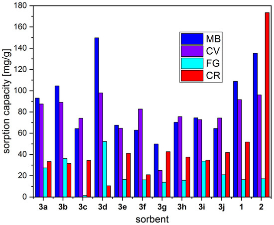 The results of initial sorption capacity determination for the four dyes for all samples 3, as well as the starting materials 1 and 2, are displayed in Figure 4. The formulae for MB, CV, FG, and CR are shown in Scheme 2. It is apparent that for all dyes, with the exception of CR, at least some of the materials 3 have a higher sorption capacity than either of the starting materials saw dust 1 and iron mud 2. For CR, iron mud 2 shows by far the highest sorption capacity. There are several general mechanisms with which dyes could adsorb to sorbents: the electrostatic attraction between the positively charged dye molecule and negatively charged sorbent or vice versa, H-bonds, van der Waals or π-bonding, hydrophobic interactions or steric reasons. It is not possible to explain the adsorption behavior in the case of CR only with electrostatic interactions (CR is negatively charged due to its sulfonate groups, and both materials 1 and 2 have been proven by FTIR to also have negatively charged carboxylate/carbonate groups), as for the other anionic dye, FG, 2 exhibits one of the lowest sorption capacities. Hydrogen bonds, van der Waals or π bonding, as well as hydrophobic interactions, generally offer a lower attraction force than electrostatic interactions, so these would likely play only a supporting role, if at all. Thus, the explanation for this behavior must lie in the structural differences, either due to the functional groups (azo vs. triphenylmethane) or in the geometry of the structures. For the three dyes MB, CV, and FG, magnetic composite 3d shows the highest sorption capacity, which is why we chose to pursue further studies with this material.