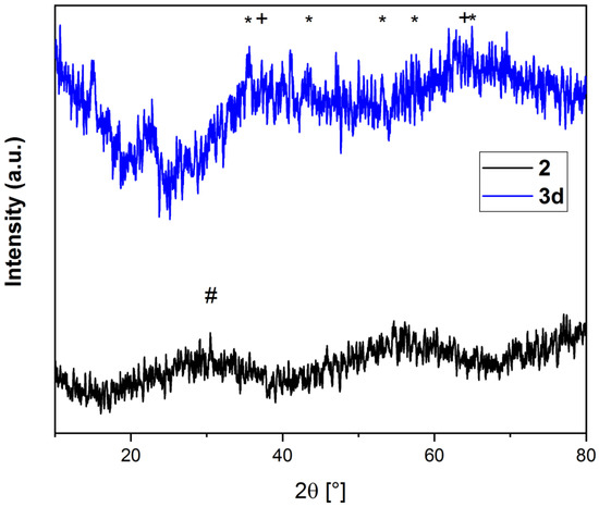 Powder diffraction patterns for samples 2 and 3d. The symbols are #: Calcite (JCPDS 72-1214), +: 2-Line Ferrihydrite (JCPDS 2-0712), *: Magnetite (JCPDS 19-0629).