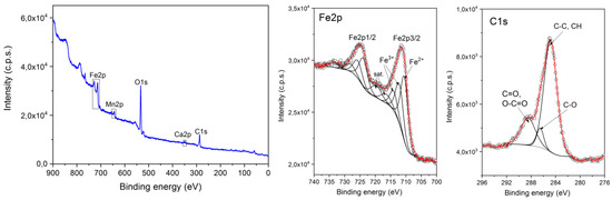 The magnetic nanocomposite 3d was subsequently also analyzed by XPS for further clarification of composition and structure (Figure 6 and Figure S5). In the survey spectrum, only the expected elements of carbon, oxygen, iron, manganese, and calcium are visible. The ratios of Mn/Fe and Ca/Fe are shown in Table S2. These ratios differ to some extent from the ones determined by EDX. The likely reason for this discrepancy is that XPS is a surface analysis method. This means that both calcium and manganese are more likely to occur on the surface of the synthesized sorbent. The Fe2p3/2 spectrum can be deconvoluted into several species and shows the presence of both tetrahedral and octahedral ferric as well as octahedral ferrous ions at 714.3, 712.5, and 710.6 eV, respectively. The ratio between ferrous and ferric ions is 0.95, which is different from the ideal ratio of 0.5 for magnetite and actually higher than could be expected from a mixture of ferrihydrite and magnetite that XRD suggested. The reason for this is, again, that XPS is a surface method. From the results, one can see that the iron mud particles have only been reduced on the surface, while the core retained ferric ions in the form of ferrihydrite. This also confirms the observation from a comparison of the morphologies that the reduction did not occur via dissolution of the iron-containing phase but rather a transformation as well as a surface reduction. In reduction reactions similar to a polyol process, it is not uncommon that the amount of ferrous ions is somewhat higher than necessary for a stoichiometric formation of magnetite [65]. These additional ferrous ions on the surface likely form amorphous structures and thus cannot be identified by XRD.