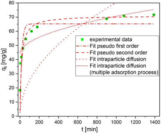 The data points for the sorption capacity obtained by varying the contact time were attempted to be fitted with curves corresponding to pseudo-first-order and pseudo-second-order kinetics, as well as the intraparticle diffusion model (see also Supporting Information). In order to have a more accurate fitting, only the nonlinear forms of the curves were used [70], and orthogonal distance regression was used for the iteration steps to account for the fact that there can be errors both in the determined values of qt as well as t. The corresponding values for R² are 0.9999 for the pseudo-first-order, 0.99995 for the pseudo-second-order, and 0.998/0.9998 for the intraparticle diffusion model with one/multiple adsorption processes. A plot of qt vs. t0.5 was also done, and the experimental data were separated into three sets of linear functions (Figure S2). The R² values for these functions were 0.974, 0.996, and 0.997, respectively.