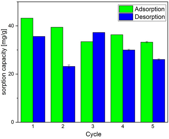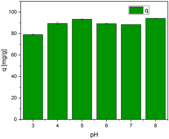 The sorption behavior of CV on 3d at different levels of pH is shown in Figure 8. As can be seen, for most of the range of pH (4–8) the sorption capacity q only changes insignificantly, between 88.4 and 93.3 mg/g. Only at pH 3 is a decrease to 79.0 mg/g (by 11%) notable. This is most likely due to the aforementioned range where CV usually desorbs. The reasons for that are likely electrostatic in nature. Magnetic sorbent 3d exhibits carboxylic acid groups, as seen from FTIR and XPS. At a more neutral pH, these groups are at least partly deprotonated, leading to negatively charged sorbent. This will bind CV (which is positively charged) electrostatically to the sorbent and thus increase the sorption capacity.
