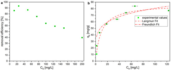 (a) Removal efficiency for initial concentration C0 of CV (b) sorption capacity for different equilibrium concentrations Ce of CV and fits for the Langmuir and Freundlich isotherm model.