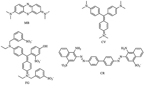 Formula of methylene blue (MB), crystal violet (CV), fast green FCF (FG), and congo red (CR).