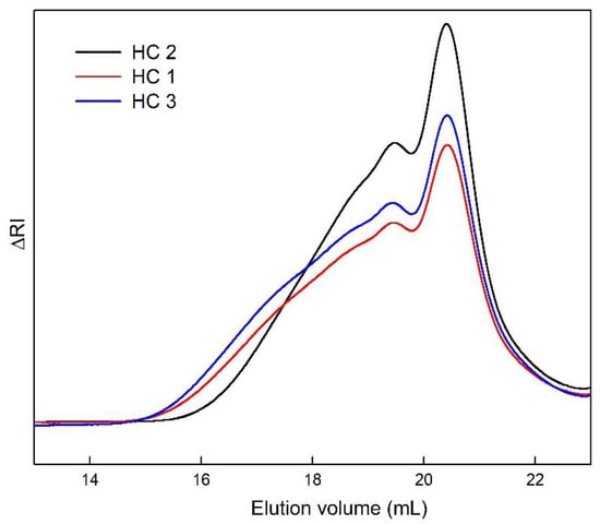 HC samples were passed through a Waters Corporation SEC set including a Waters 1515 isocratic pump, three µ-Styragel mixed pore separation columns of 102 to 106 Å pore diameter and a Waters 2414 refractive index detector equilibrated at 40 °C. The eluent consisted of a mixture of 5% v/v triethylamine in THF at a flow rate of 1.0 mL/min. The SEC column set was calibrated by linear monodisperse polystyrene standards of average molecular weights between 1200 and 152,000 g/mol, while Breeze 2 software was used for data acquisition and analysis.