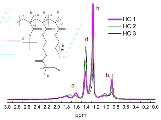 1H-NMR spectra of the precursor HCs (Hydrogen peak assignments are represented by the letters).