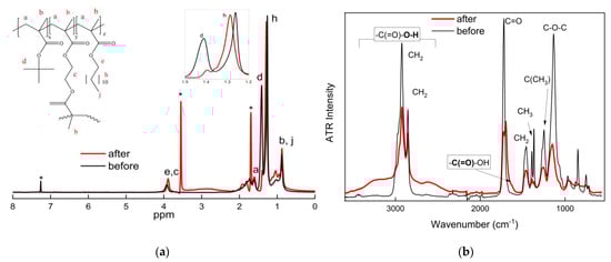 1H-NMR spectra in CDCl3 and d8-THF (a) and FT-IR ATR spectra (b) of HC 2 before and after 24 h hydrolysis (The letters in 1H-NMR spectra represent hydrogen peak assignments and the star (*) symbols are attributed to CDCL3 and d8-THF).